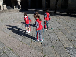 Por ahora, xogamos as chapas, os trompos, a saltar a corda, á goma, o peletre/rayuela/mariquiña e a comba. Déixovos unhas fotos da maioría das clases practicando estes xogos: