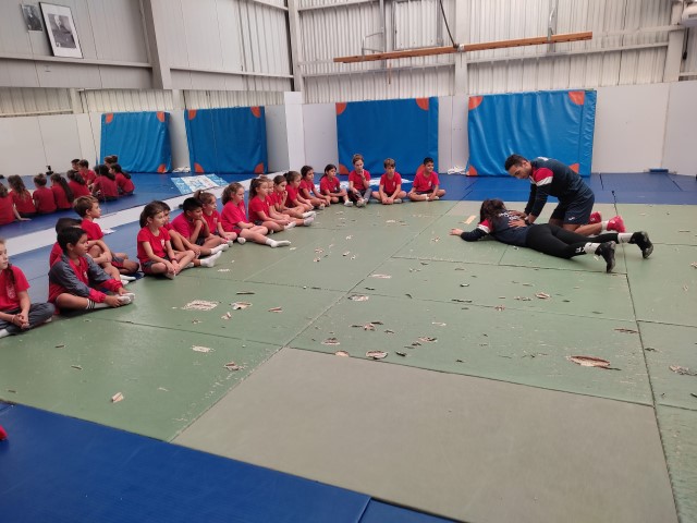 O alumnado de 3º e 4º de educación primaria, puideron disfrutar dunha sesión de loita olímpica impartida pola campiona nacional Nerea Pampín e polo integrante da selección galega Saúl Bello onde puideron practicar as diferentes técnicas deste fantástico deporte.